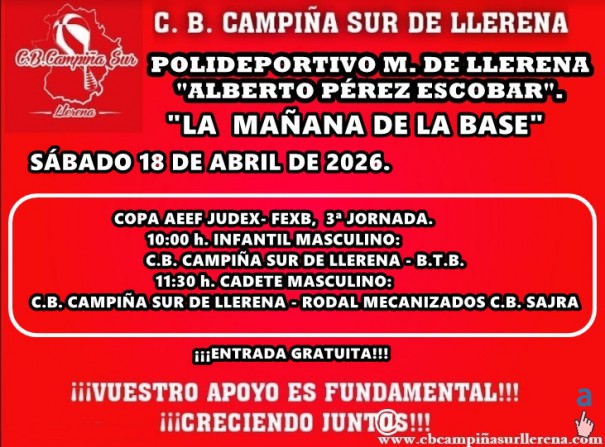El sábado 18 de abril de 2026, "LA MAÑANA DE LA BASE" en el "ALBERTO PÉREZ", con la tercera y última  jornada de la  fase de grupos de la COPAAEFF JUDEX-FEXB para nuestros equipos MASCULINOS, INFANTIL Y CADETE ¡¡¡A LLENAR EL "ALBERTO PÉREZ!!! Debe ser de nuevo la fiesta del baloncesto, animando al máximo, SIEMPRE DESDE EL RESPETO Y LA DEPORTIVIDAD.