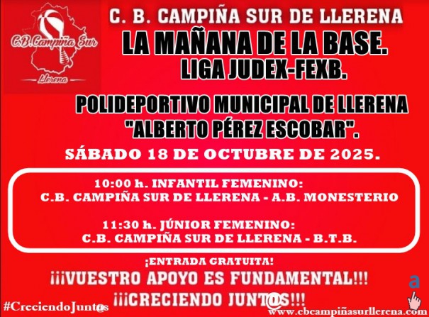 El próximo fin de semana, comenzará la temporada para nuestros equipos de la BASE, en JUDEX-FEXB, y de nuestro equipo SÉNIOR MASCULINO que compite en el TROFEO DIPUTACIÓN DE BADAJOZ, el domingo por la mañana en la pista de M.G.S. FUENTE DE CANTOS C.B. Nuestros equipos INFANTIL Y CADETE MASCULINO, jugarán la tarde del viernes en la pista del A.B. MONESTERIO. Nuestros equipos FEMENINOS INFANTIL Y JÚNIOR, juegan "LA MAÑANA DE LA BASE" el SÁBADO 18 DE OCTUBRE DE 2025 en el "ALBERTO PÉREZ".