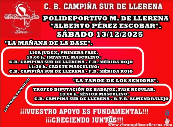 Se llevará a cabo la octava jornada de la temporada para nuestros equipos de la BASE, en JUDEX-FEXB. Nuestro equipo INFANTIL FEMENINO, jugará la tarde del viernes en la pista de A.B. MONESTERIO. Nuestro equipo JÚNIOR FEMENINO, jugará la mañana del sábado en la pista del B.T.B. ALMENDRALEJO. Nuestros equipos MASCULINOS INFANTIL Y CADETE, juegan "LA MAÑANA DE LA BASE" el SÁBADO 13 DE DICIEMBRE DE 2025 en el "ALBERTO PÉREZ". ¡NO FALTÉIS!