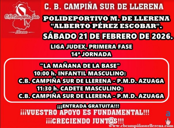 Nueva jornada de la temporada para nuestros equipos de la BASE que compiten en JUDEX-FEXB. Nuestros equipos FEMENINOS, INFANTIL y JÚNIOR, jugarán respectivamente la mañana del sábado en la pista del C.B. MAIMONA y la tarde del viernes en la pista de EL TEMPLO EVENTOS B.B. BADAJOZ. Nuestros equipos MASCULINOS INFANTIL Y CADETE, juegan "LA MAÑANA DE LA BASE" el SÁBADO 21 DE FEBRERO DE 2026 en el "ALBERTO PÉREZ". ¡NO FALTÉIS!